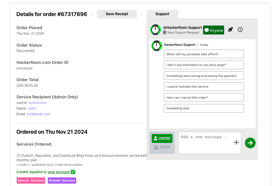 HackerNoon’s Inbox isn’t just for draft reviews — it also helps you manage any services you purchase on the platform. If something goes wrong with an order or you need help understanding a purchased service, you can contact support directly from the service order page.